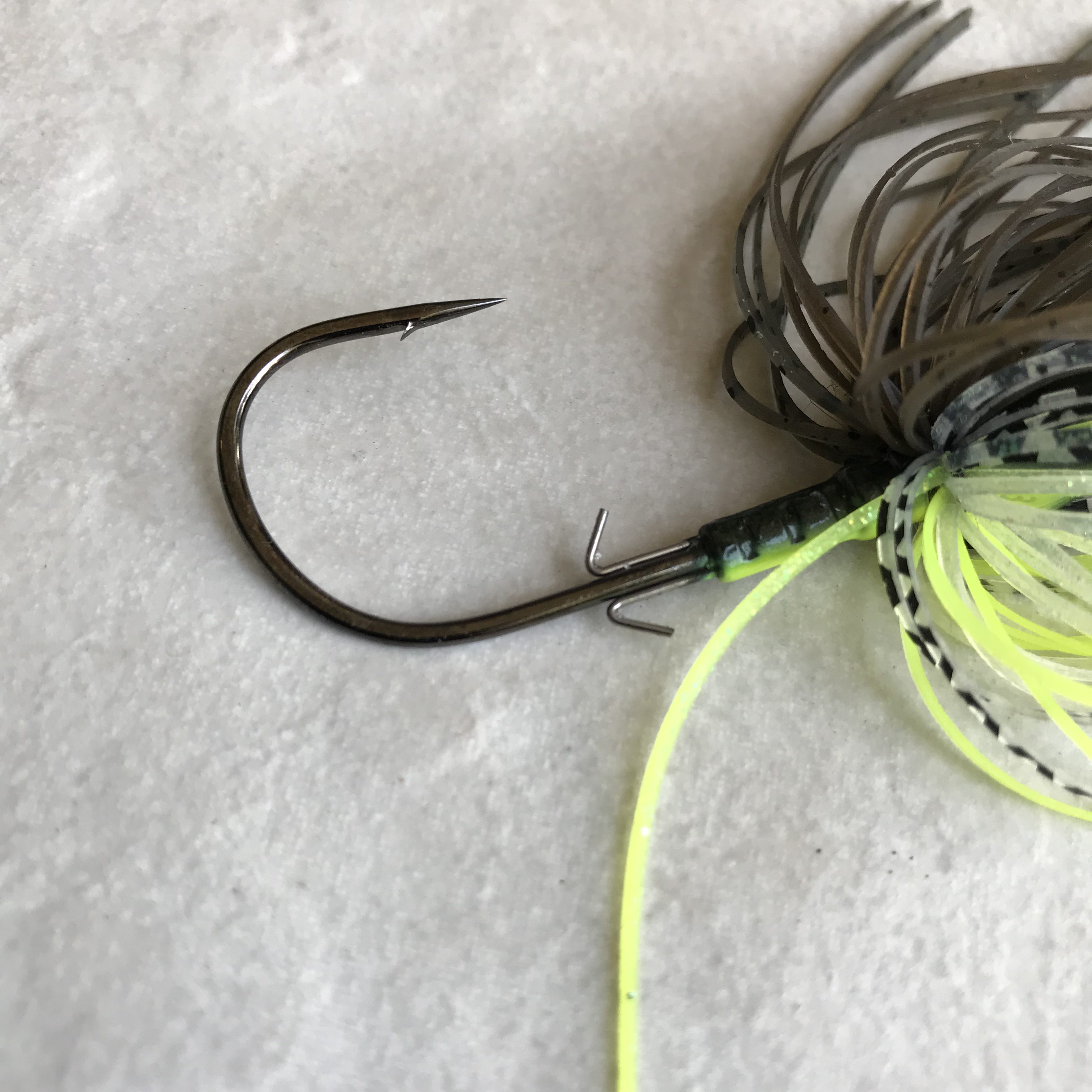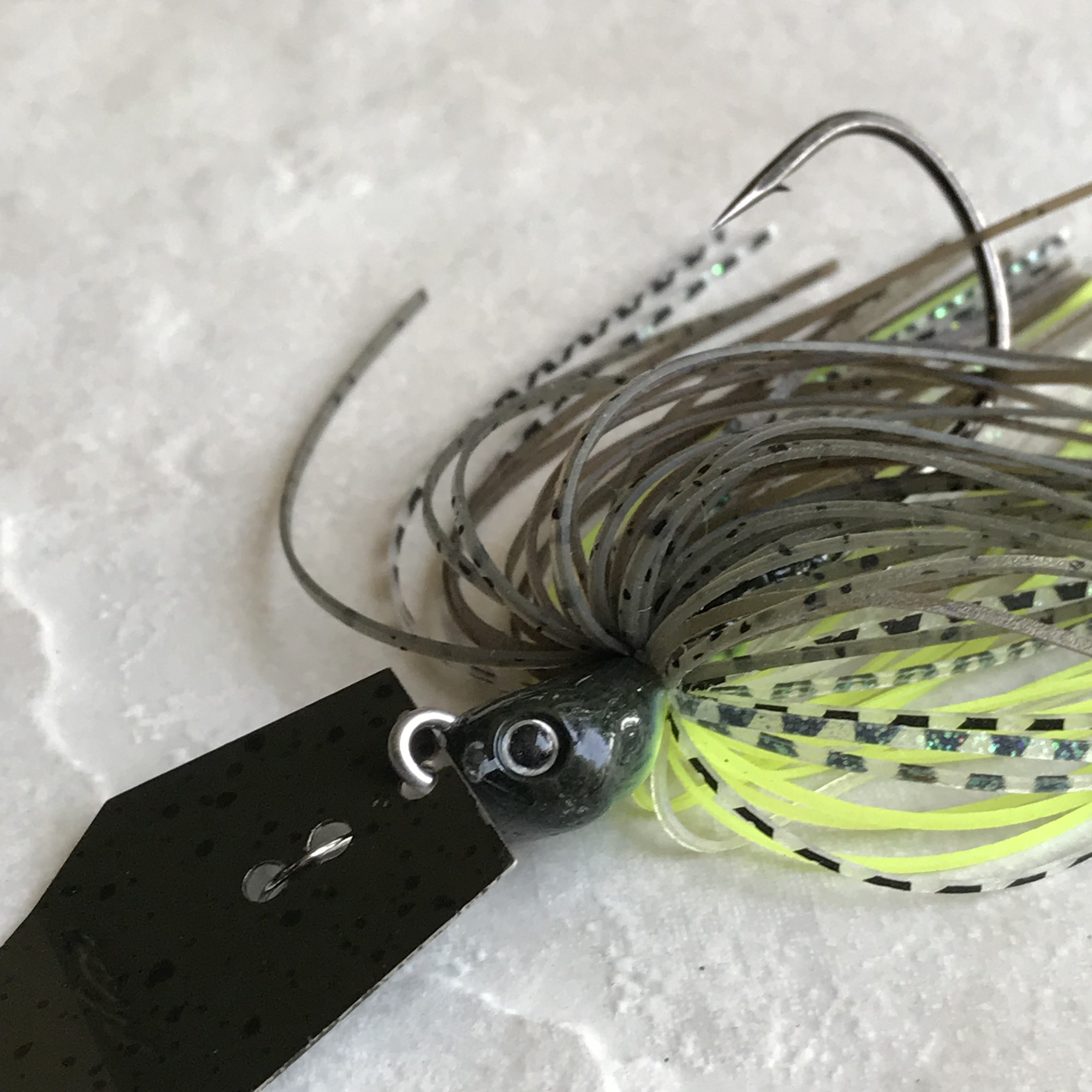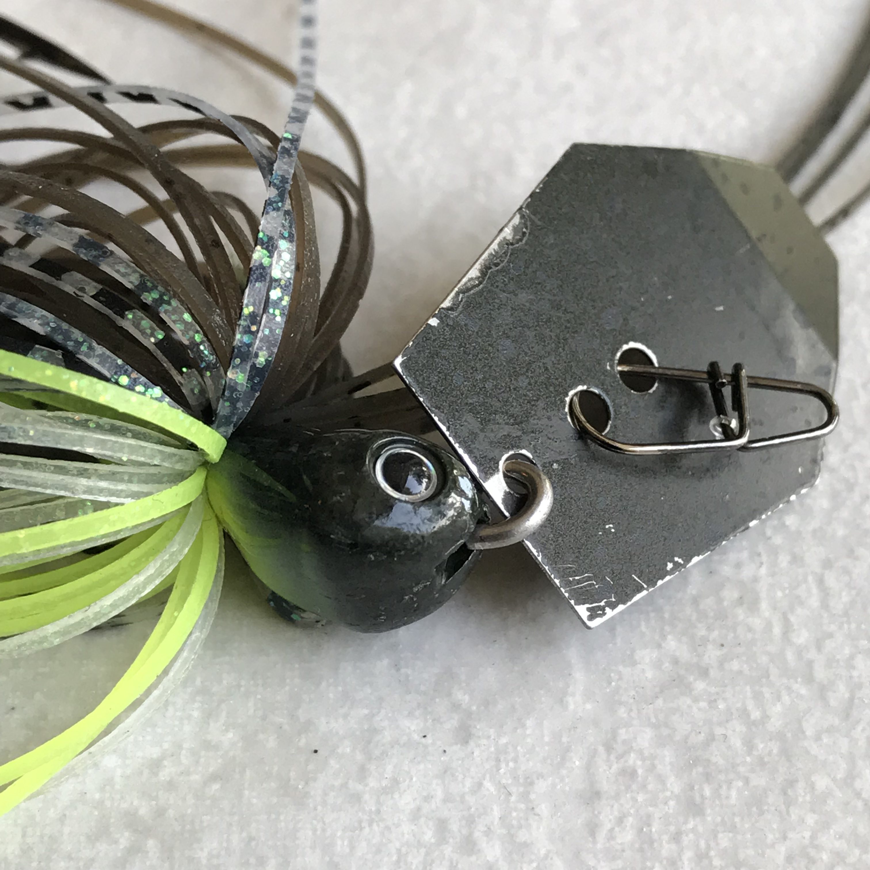 The construction of this bladed jig starts with a head that has a flat bottom, 3D eyes, a thin but strong stainless steel blade, a Gamakatsu heavy wire hook, a double trailer keeper, hand tied skirt and a heavy duty snap. All of this in a more compact package than a lot of chatterbaits out there.